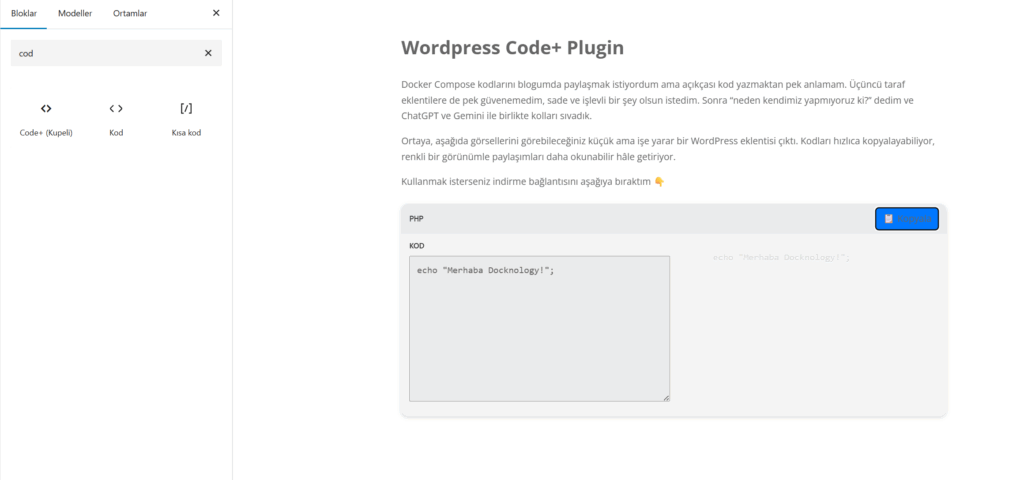 Ortaya, aşağıda görsellerini görebileceğiniz küçük ama işe yarar bir WordPress eklentisi çıktı. Kodları hızlıca kopyalayabiliyor, renkli bir görünümle paylaşımları daha okunabilir hâle getiriyor.