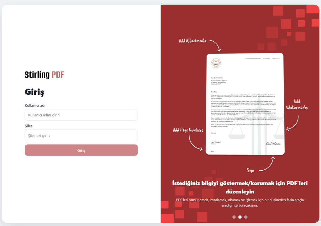 Stirling PDF, açık kaynaklı bir PDF düzenleme platformu. Tarayıcı üzerinden erişiyorsun, yani ekstra bir yazılım kurmana gerek yok.