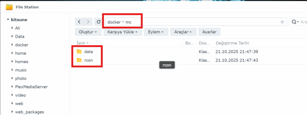 Docker dizini altında mc ve rcon adında iki dizin oluşturun