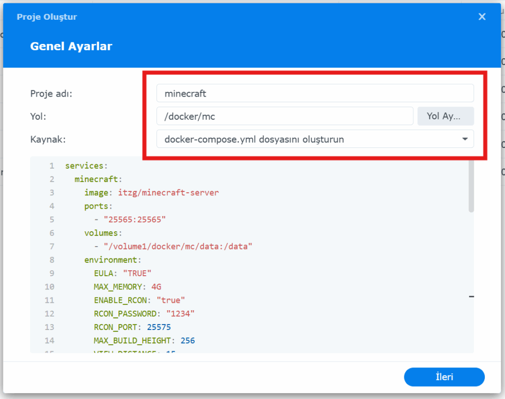 Container Maneger ile yeni proje oluşturun. Proje için bir isim, az önce açtığımız Mc dizininin yolu ve kaynak dosyasını oluşturu seçin. kaynak kodlarıda aşağıdan kopyalayıp yapıştırın ve İleri butonu ile devam edin. Son olarak bitir dediğinizde minecraft sunucunuz başlayacak ve rcon web admin çalışmaya başlayacak.