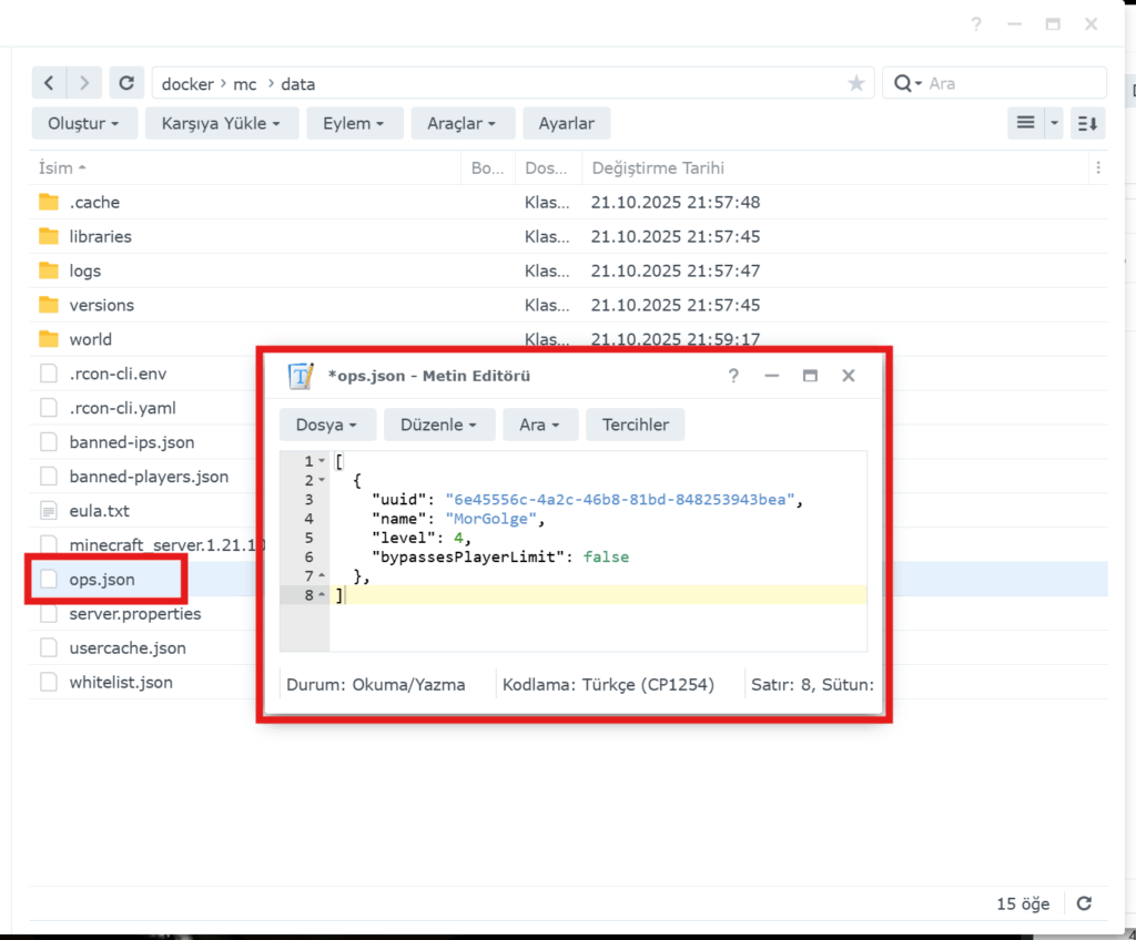 Eğer modeminizden 4326, 4327 ve 25565 portlarını açarak uzakta ki sevdiklerinizle minecraft oynamaya başlayabilirsiniz. Tabi oyunda bir de yöneticiye ihtiyacımız var. bunun için data dizini içerisinde ops.json dosyasını açmalısınız.